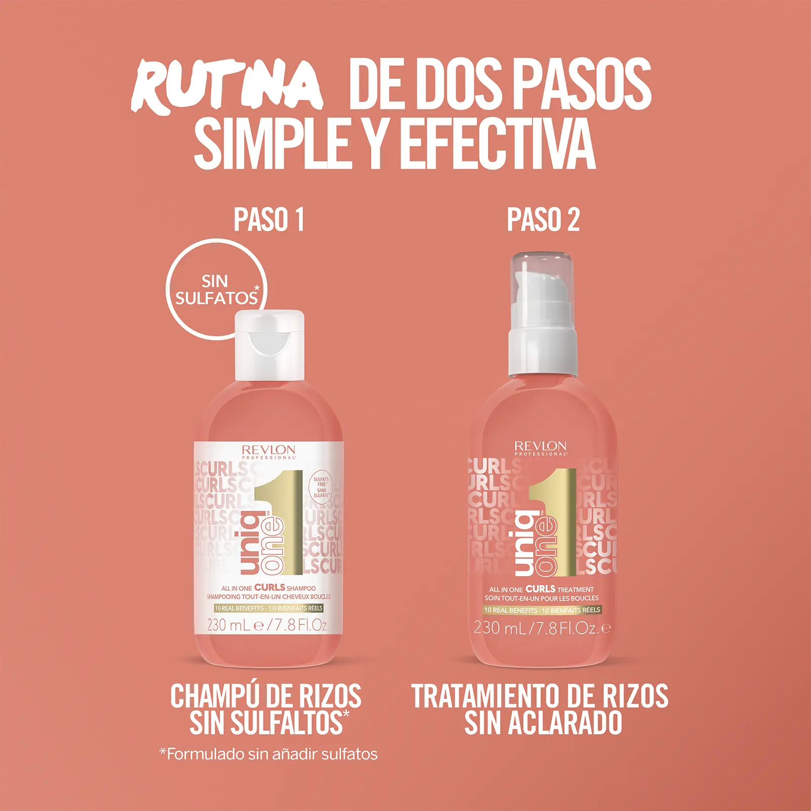 - Paso 1: El champú UniqOne™ Curls es una fórmula sin sulfatos* que limpia sin eliminar la humedad y mantiene el volumen natural de los rizos.