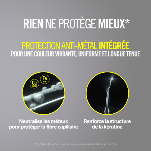 L’ultime complexe couleur et soin renforce, scelle et protège l’intégrité des cheveux de l’intérieur garantissant une application couleur précise, pour des reflets visibles, fiables et sophistiqués ainsi que des résultats couleur augmentés longue durée.PROTECTION ANTI-MÉTAL INTÉGRÉE